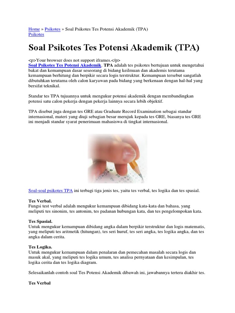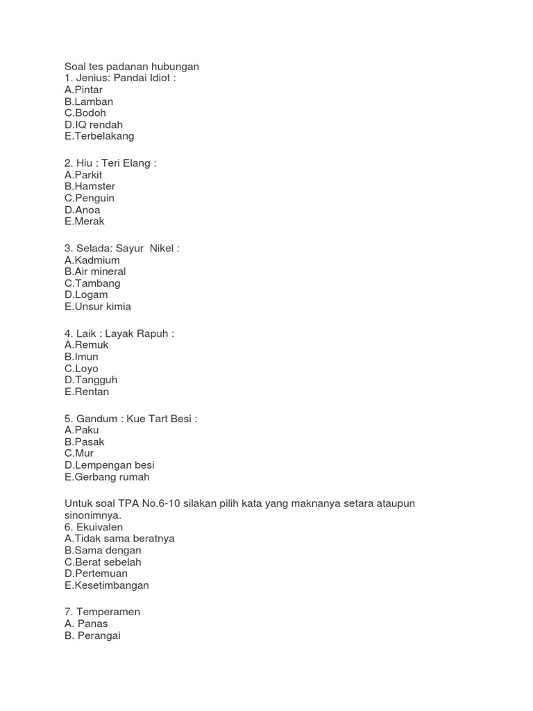 Contoh soal test padanan : Belajar tes psikotes padanan hubungan kata ini sangat berguna untuk dipelajari karena ini adalah soal yang sangat umum digunakan dalam berbagai tes. A short summary of this paper. Contoh soal tes potensi akademik padanan hubungan kata.plot karena di dalam sebuah sandiwara ada satu bagian yang disebut plot. Mempelajari tes psikologi kecocokan hubungan kata sangat berguna untuk dipelajari karena merupakan pertanyaan yang sangat umum digunakan dalam.