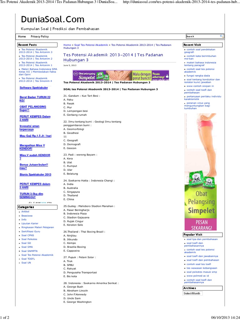 Dunia Article Cara Menjawab Soal Test Padanan Hubungan from 4.bp.blogspot.com Soal cpns analogi atau padanan hubungan kata ini termasuk dalam ujian seleksi kompetensi dasar atau skd yakni pada tes intelegensia umum atau tiu. Tes analogi merupakan tes untuk mengukur sampai sejauh mana anda dapat melihat pola sebuah kata atau fungsi dari kata tersebut dan menarik makna dari kata. Contoh soal analogi verbal dan jawabannya ini kami sajikan untuk mendukung persiapan anda. Pilihlah salah satu jawaban yang memiliki pola analogi yang paling mendekati dengan yang ditunjukan pada kata yang dicetak dengan huruf kapital! Belajar tes psikotes padanan hubungan kata ini sangat berguna untuk dipelajari karena ini adalah soal yang sangat umum digunakan dalam berbagai tes. Berikut ini kami ulas secara lengkap dan mendalam serta diilengkapi juga dengan soal. Tes verbal berfungsi untuk mengukur kegesitan mental seseorang di bidang kata dan bahasa. Pada tes ini di minta kemampuan mengerti akan arti kata, fungsi kata, dan pemakaian serta padanan.